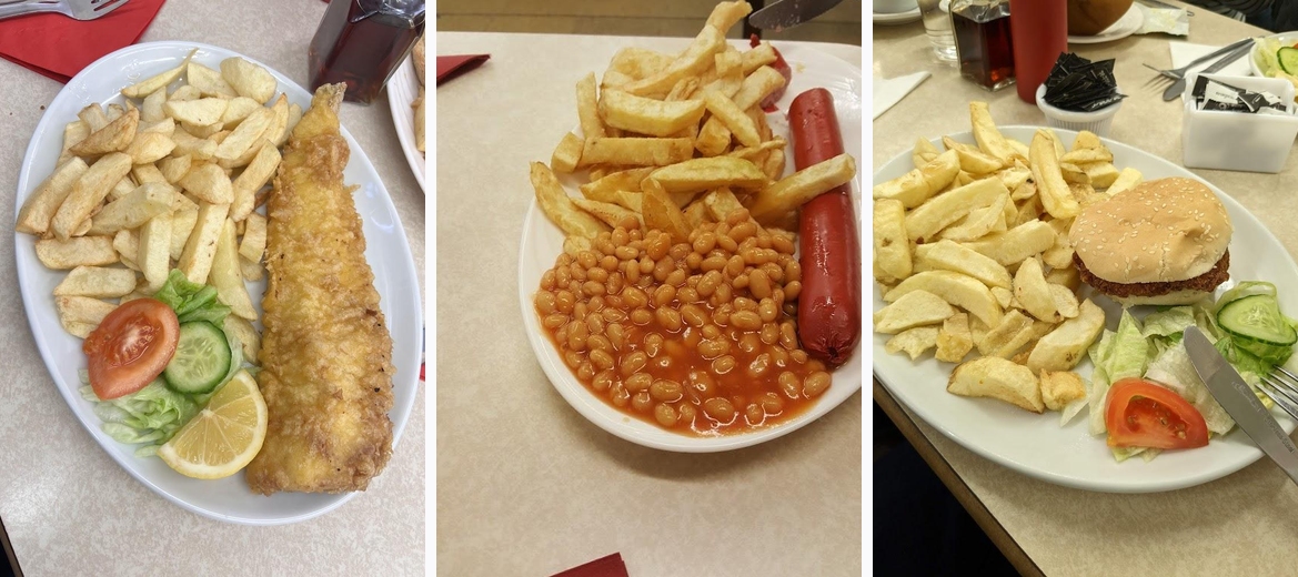 The standout offerings include their Large Skinless Cod with chips, Scampi and Chips, and the Half Pounder Burgers. For kids, the Sausage Chips and Beans are a favorite.